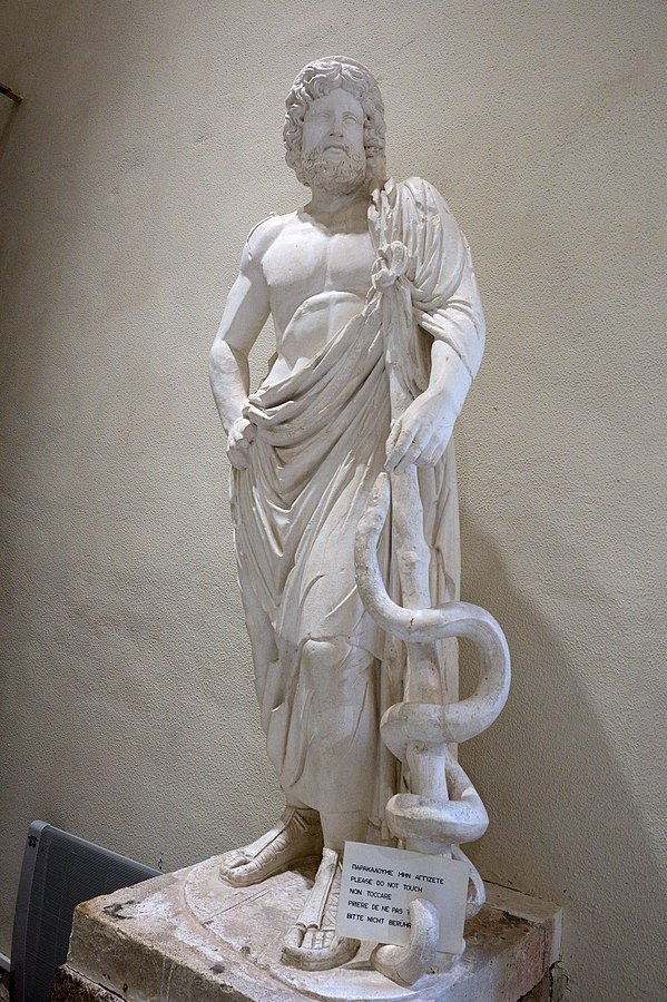 The caduceus is probably another symbol of the world axis, the snake-entwined staff representing the snake-entwined pole in the heavens. Asclepius, the Greek god of medicine, was similarly depicted with a snake entwined staff or club.